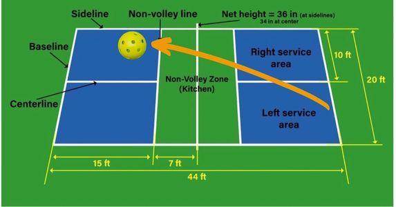 A pickleball court measures 20×44 feet. The same court is used for both singles and doubles play. The court is striped similar to a tennis court with right and left service courts and a 7-foot non-volley zone in front of the net (the “kitchen”).